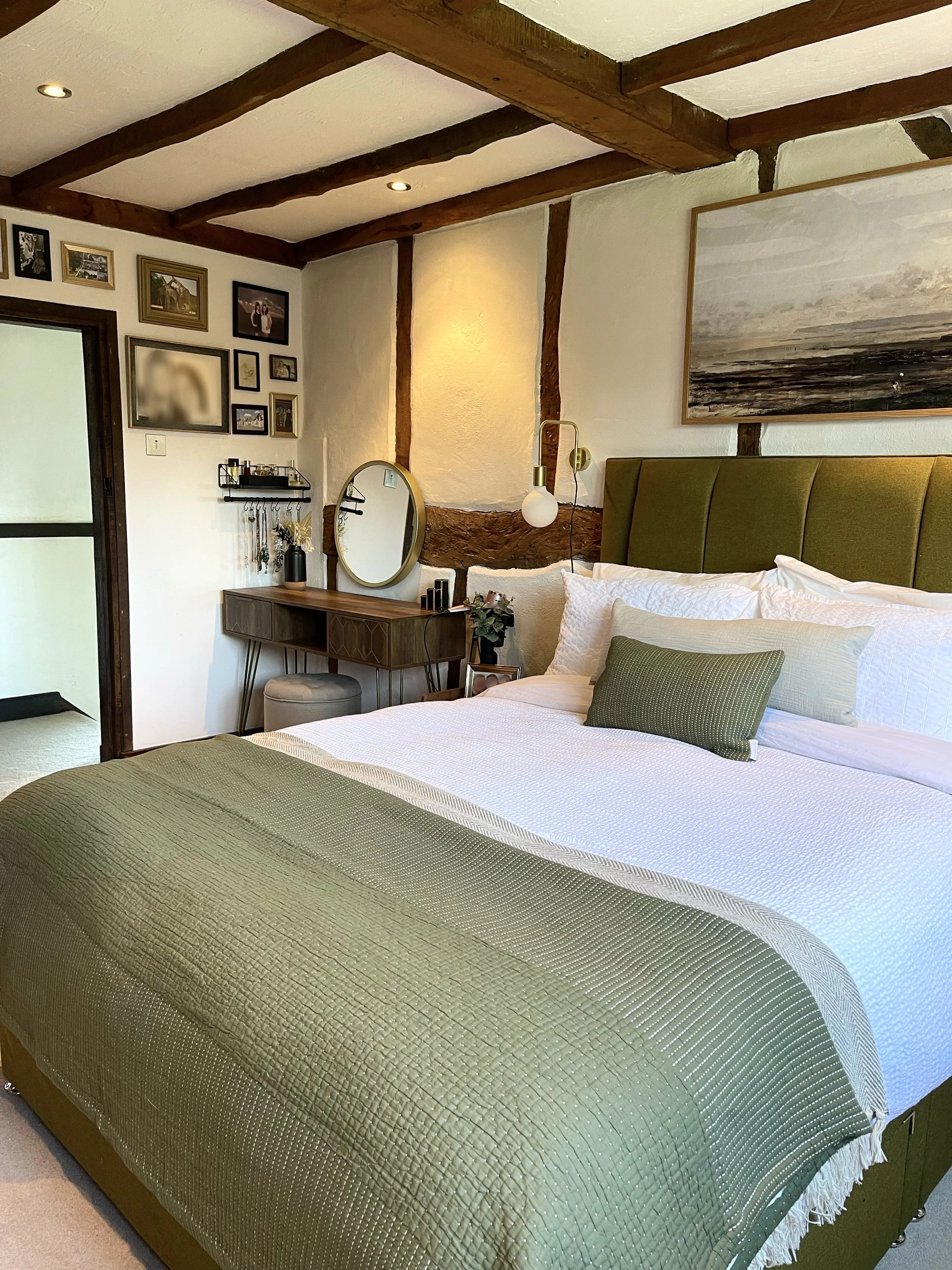 In this beautiful 1700 cottage our client wanted to redesign her bedroom. We spent time getting to know our client, understanding their lifestyle and design style to achieve the perfect outcome. This design was inspired by the natural wooden beams on the walls and ceiling. The gallery wall creates a personal moment, the greenery captures the essence of nature, and the gold finishing touches add a modern edge.